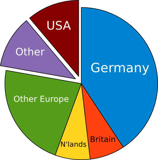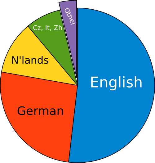 Interestingly, it seems not all of those users in Germany use GpsPrune in German, as the second pie chart illustrates that the dominant language is still English. Maybe those people in Germany are not native German speakers, or maybe they're just used to their computer software running in English.