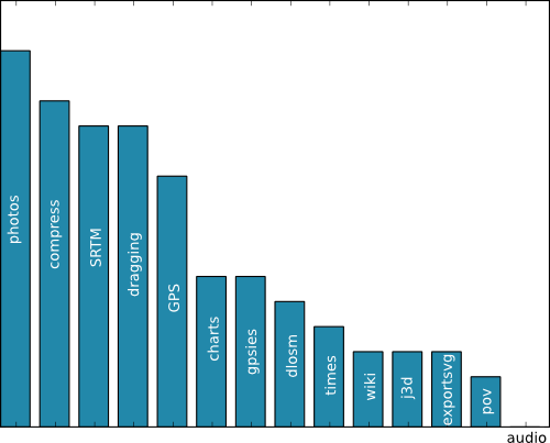 Lower down on the popularity scale are generating charts with gnuplot, downloading and uploading to gpsies.com, and downloading map data from OSM. This surprises me too, I thought that practically noone uses this any more. Now I wonder whether my question was misinterpreted and some people thought the question was referring to the map tiles. Alas that means I can't just remove this feature as I thought. Then there's the time estimation functions, relatively high given their recent addition, and the wikipedia functions which I use a lot but apparently aren't that popular. Or are they too well-hidden?