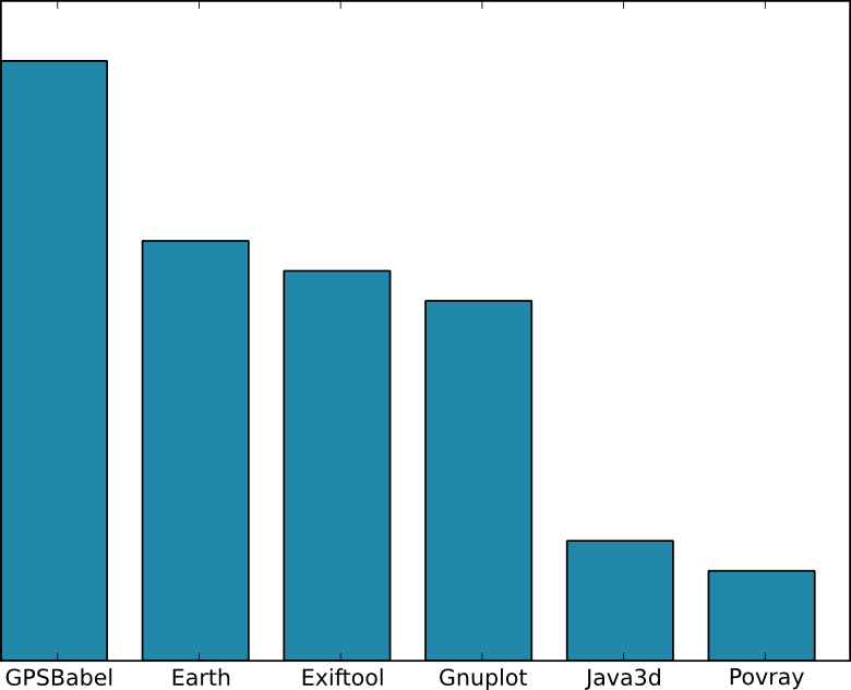 The second chart shows which other programs people use alongside GpsPrune. Fairly predictably, GPSBabel is a firm favourite, and is presumably used to communicate with a GPS receiver (loading or sending data) or perhaps for importing special files. Next is Google Earth, an obvious (although not open-source) choice for visualizing the tracks from GpsPrune. Then Exiftool, used for writing GPS coordinates into photograph files.