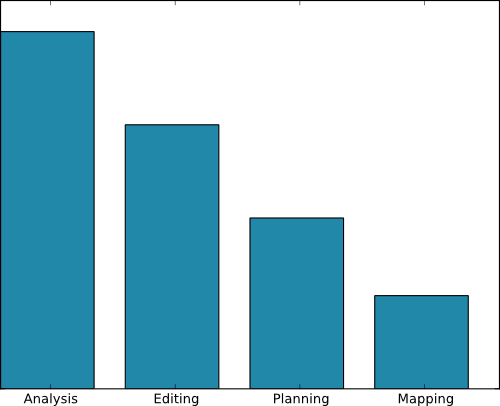 Firstly we look at what overall purpose people use GpsPrune for. In this case the first chart shows us that the most popular use is to analyse recorded data after a trip. So that probably means examining distances, climbs, speeds and so on, and perhaps comparison with maps or with other tracks. Next comes editing and conversion, so that is again working with recorded data but more geared towards preparation for publishing, conversion to other formats and splitting and joining of files.