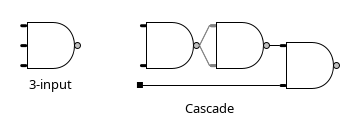 Having mastered the two-input gates, we can now extend this to three input gates. LogicSim lets you right-click on such a gate and with "Add input" and "Remove input" lets you change the number of inputs from 2 to 5.